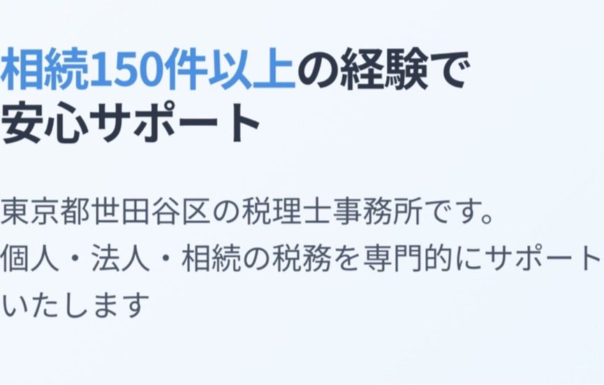 シンプルな相続から複雑な資産構成の案件まで、幅広くサポートしております。難解な土地評価や複雑な相続についても、150件以上の豊富な実績と専門知識で、お客様に寄り添いながら最適な解決策をご提案いたします。