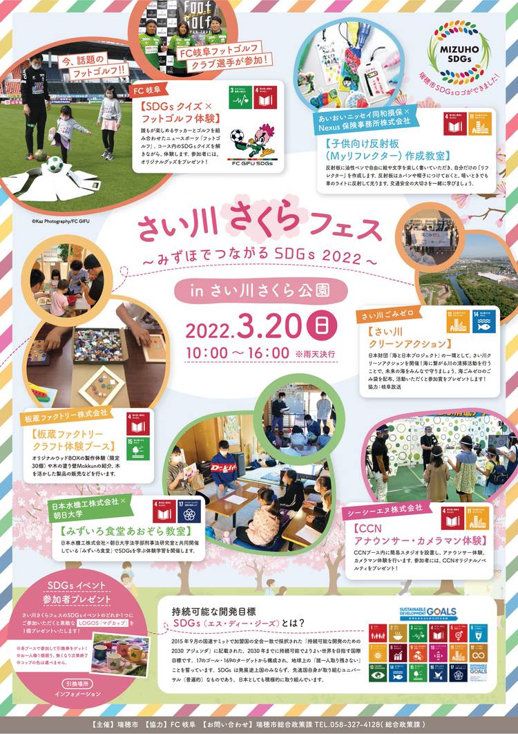 本日はイベントのご案内をさせて頂きます。 瑞穂市初!!SDGsイベント。 今話題のSDGsを知ることができる体験型アクティビティに当社も参加致します。 「さい川さくら公園」一帯の豊かな水と緑があふれる空間を舞台に、SDGsを考え、学びながら体験できるコンテンツが盛りだくさん!! 豊かな自然の中で、SDGsを感じながら、身体を動かすことや考えることの楽しさ・大切さが感じられるイベントです。 ぜひご...