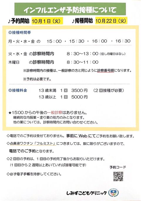 予防接種:月火水金 13:30〜15:00 予約制
