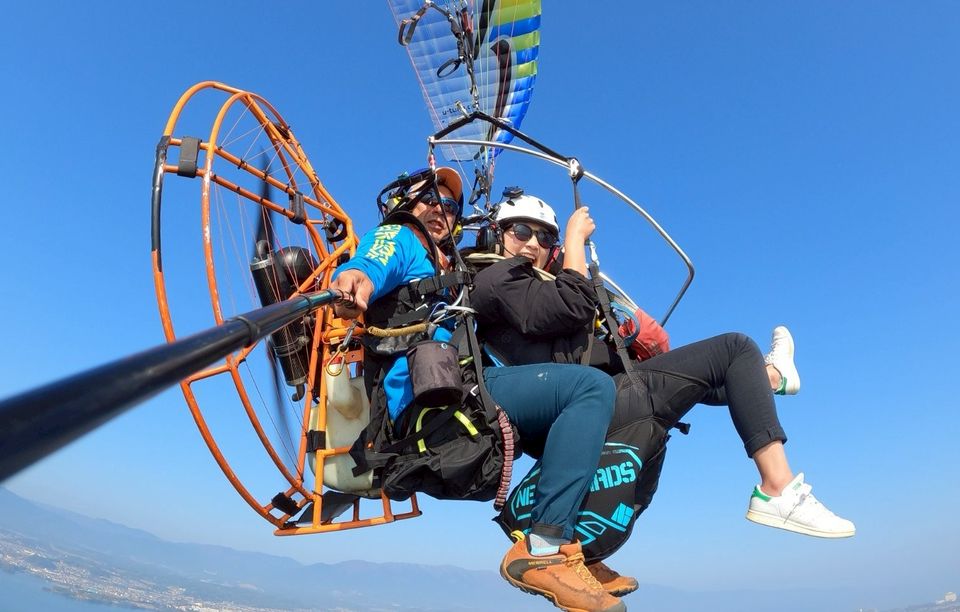 滋賀/琵琶湖で2人乗りモーターパラグライダー体験フライトを行っています。インストラクターの操縦するパラグライダーで琵琶湖の空を空中散歩してみませんか。