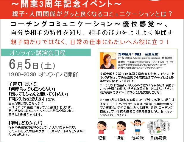 開業3周年記念イベント 6/5(土)無料オンラインセミナー お申込み:https://www.global-family-campus.org/coachingseminar202106 ♪親子・人間関係がグッと良くなるコミュニケーションとは?♪ コーチングコミュニケーション~優位感覚~、 自分や相手の特性を知り、相手の能力をよりよく伸ばす 親子間だけではなく、日常の仕事にもたいへん役に立つ