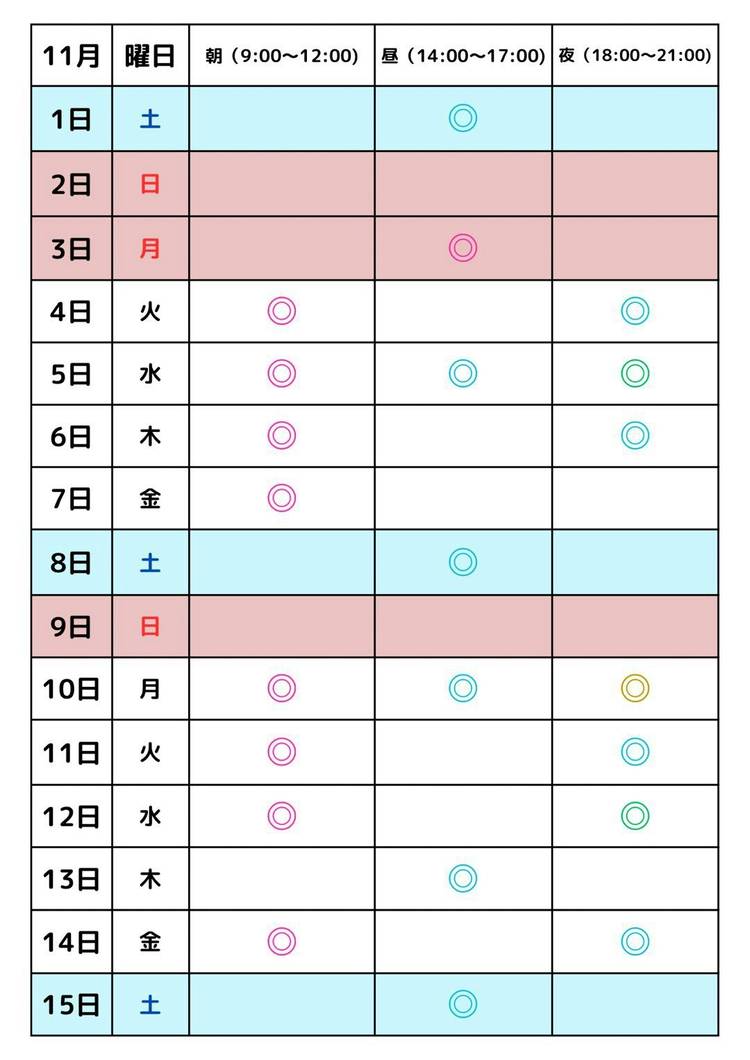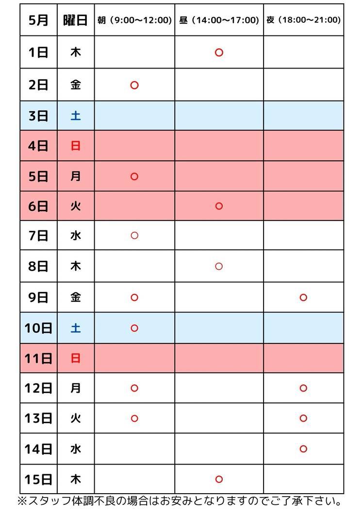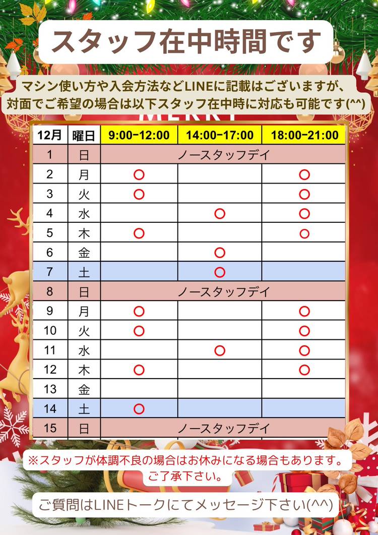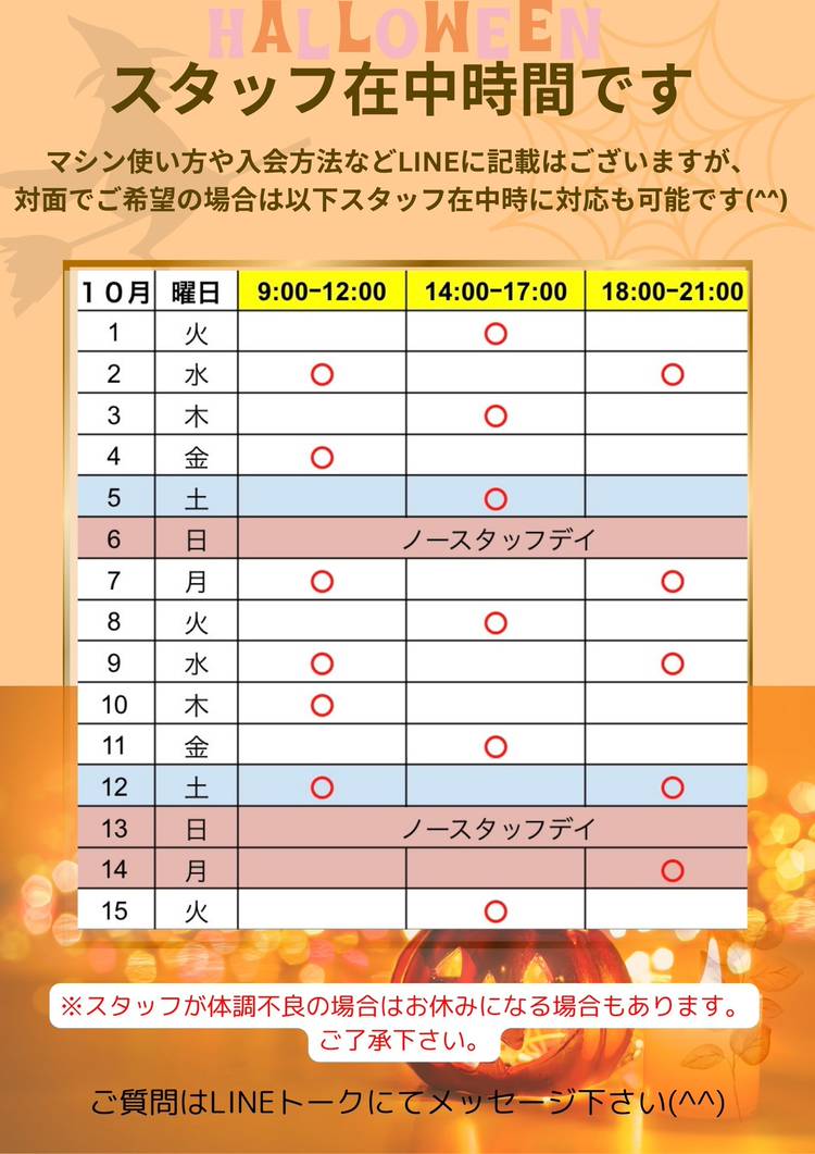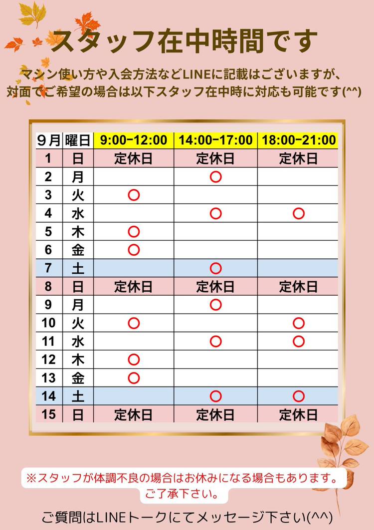 【9月のスタッフ在中時間】 体験やご不明な点などお気軽にスタッフにお尋ね下さい(^^) ※スタッフの体調不良など急なお休みいただく場合があります。ご理解よろしくお願い致します🙇🙏