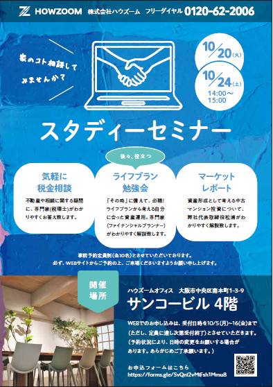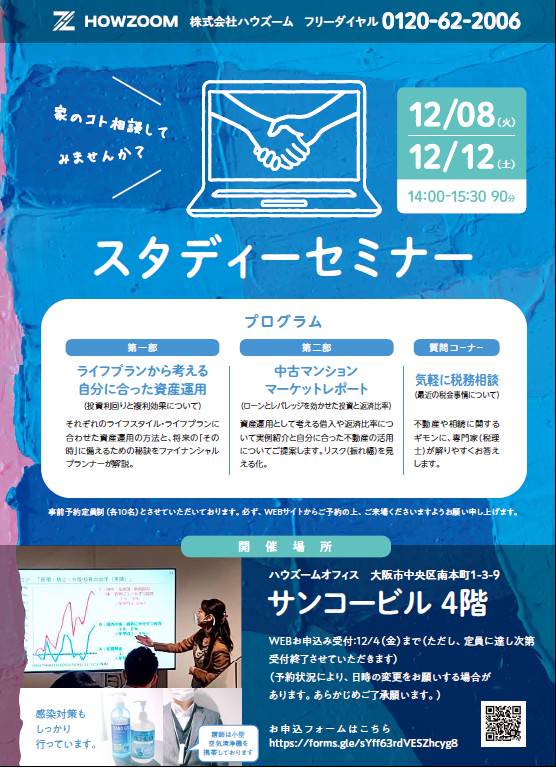 第二回(2020年12月度)HOWZOOMスタディーセミナーを開催致します。 「税金」「ライフプラン」「不動産投資マーケットレポート」を、一緒に勉強してみませんか。 ■日時 ①12/8(火) 14:00~15:30(途中10分休憩含む) ②12/12(土) 14:00~15:30(途中10分休憩含む) ■定員 各日程とも、先着10名様 ■会場 ハウズーム セミナールーム 大阪市中央区南本...