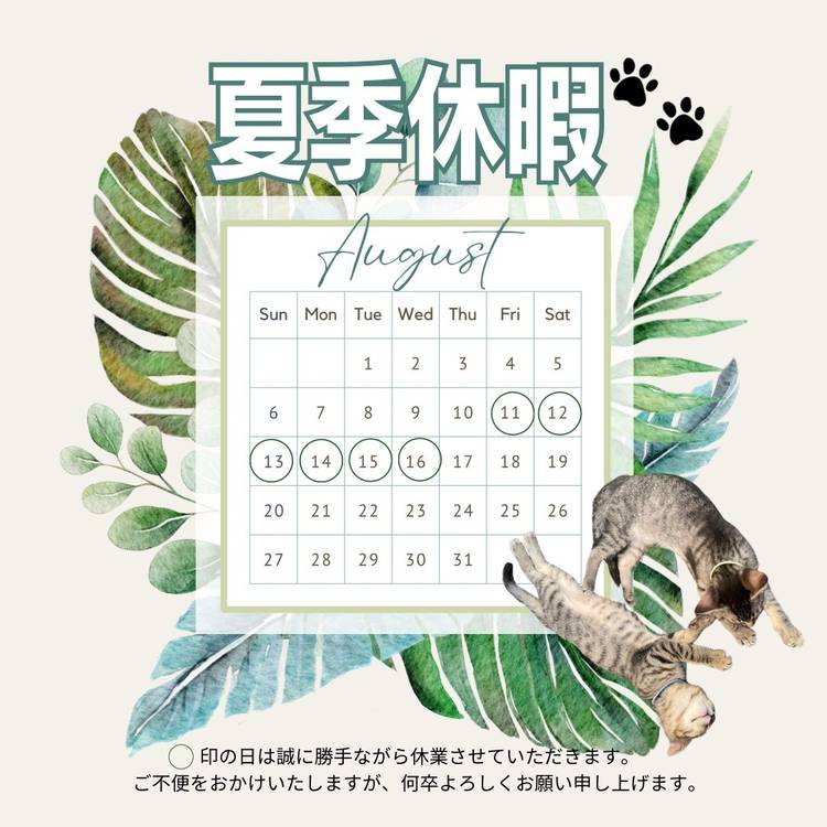 夏季休暇のお知らせ 8月11日㈮~8月16日㈬ まで誠に勝手ながら休業させていただきます。 ご不便をおかけしますが、何卒よろしくお願い申し上げます。