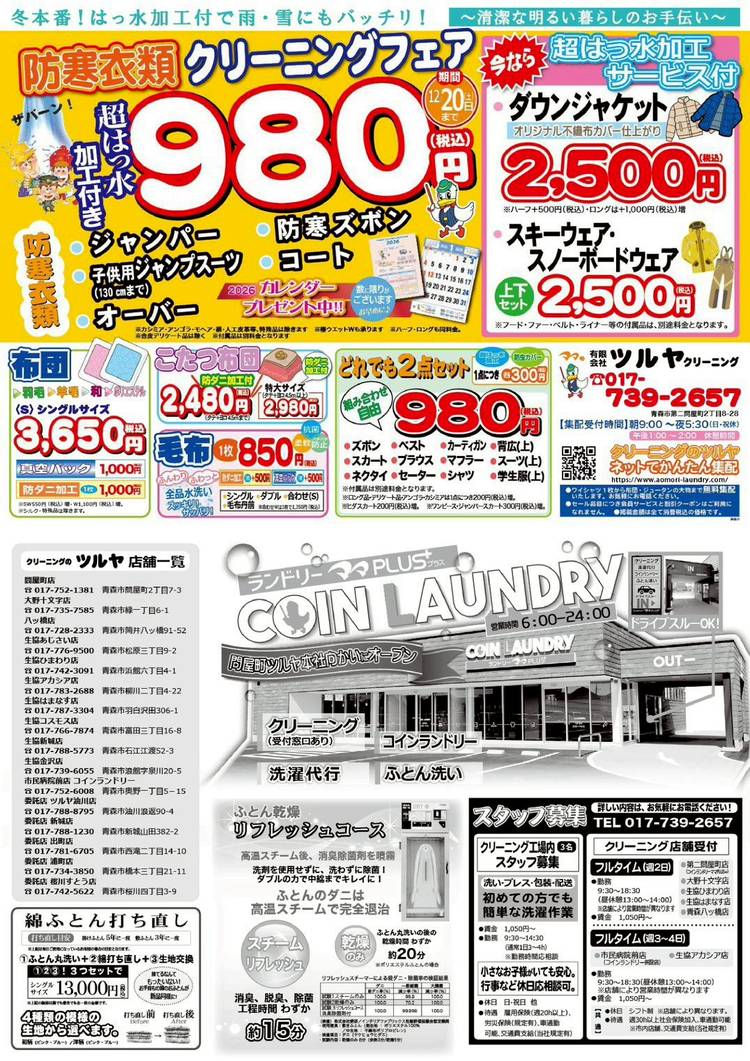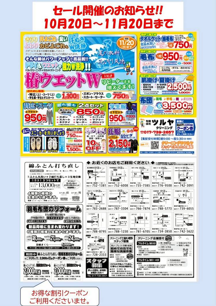 ツルヤクリーニング大野十文字店よりセールのお知らせです😃 10月20日(月)から11月20日(木)まで秋のスッキリ!爽快!クリーニングセールが始まります☀️ お得① 椿ウェットW 背広 学生服 学生ヒダスカートお試し価格の1100円👀‼️ ズボン ブラウス スカート セーターお試し価格の750円👀‼️ お得② タオルケット、綿毛布は防ダニ加工付で750円👀‼️ お得③ 肌掛け、...