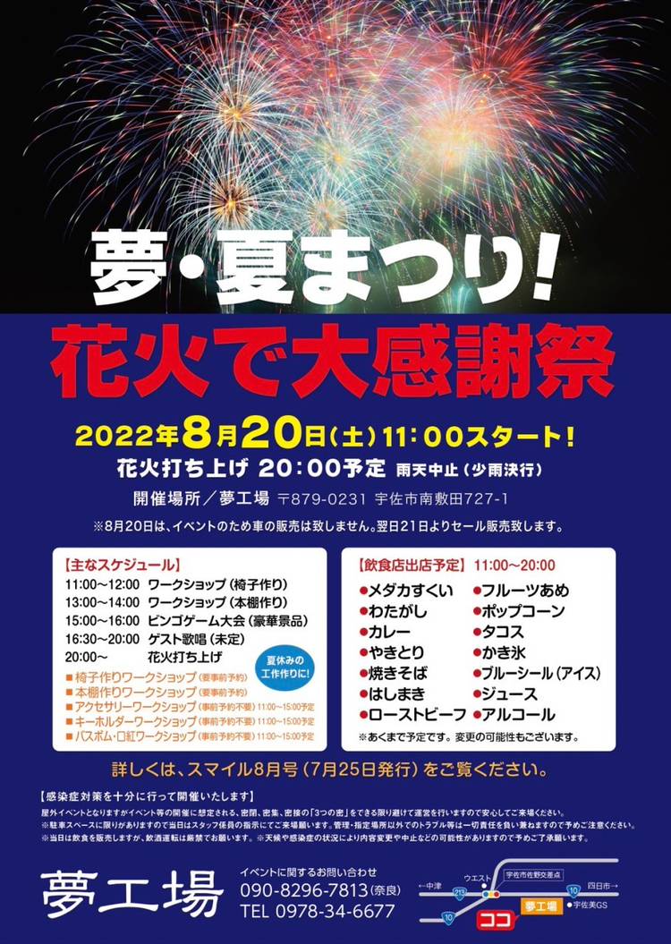 有限会社 夢工場です! 8月20に当社でお祭りイベントを行います! ワークショップ要予約の物もあるので、どなたでも予約のお電話お待ちしております!