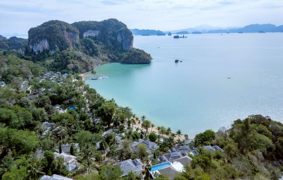 ห้องพักตั้งอยู่บนเนินเขาของรีสอร์ท มีสระน้ำแบบแช่ตัวที่มองเห็นวิวทะเลของอ่าวพังงา