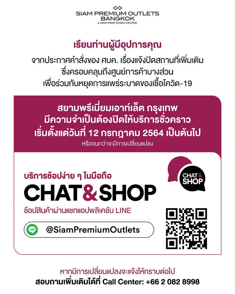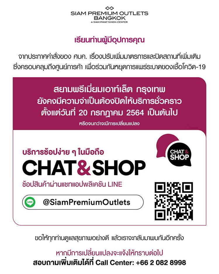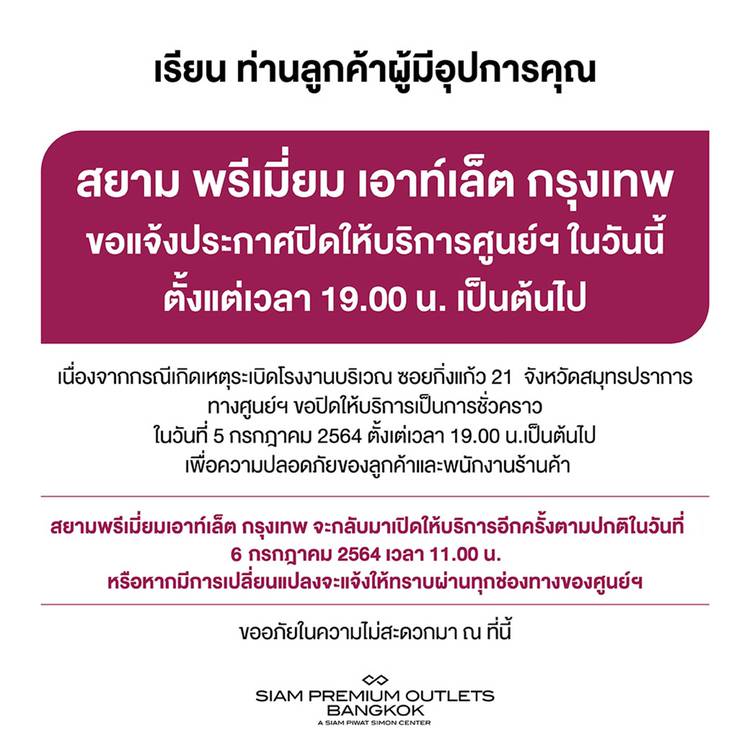 เรียน ท่านผู้มีอุปการคุณ ตามประกาศคำสั่งศบค. ณ วันที่ 18 กรกฎาคม 2564 เรื่องปรับเพิ่มมาตรการและแจ้งปิดสถานที่ซึ่งครอบคลุมถึงศูนย์การค้า เพื่อหยุดการแพร่กระจายของเชื้อโควิด-19 บริษัทฯขอเรียนลูกค้าทุกท...