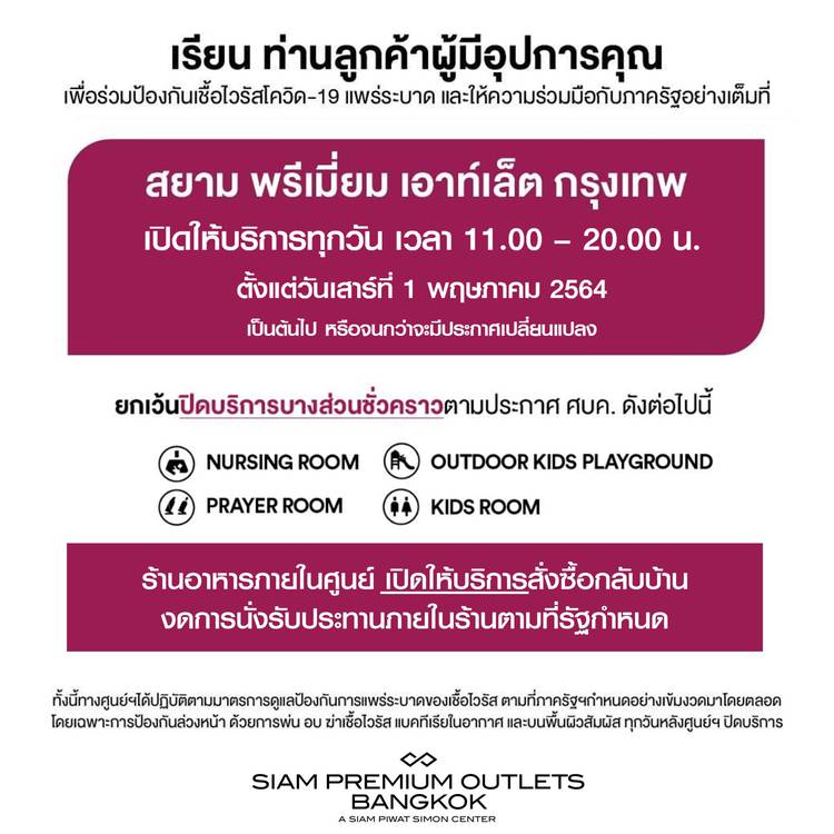 เรียน ท่านผู้มีอุปการคุณ ตามประกาศคำสั่งศบค. ณ วันที่ 1 สิงหาคม 2564 เรื่องปรับเพิ่มมาตรการและแจ้งปิดสถานที่ซึ่งครอบคลุมถึงศูนย์การค้า เพื่อหยุดการแพร่กระจายของเชื้อโควิด-19 บริษัทฯขอเรียนลูกค้าทุกท่...