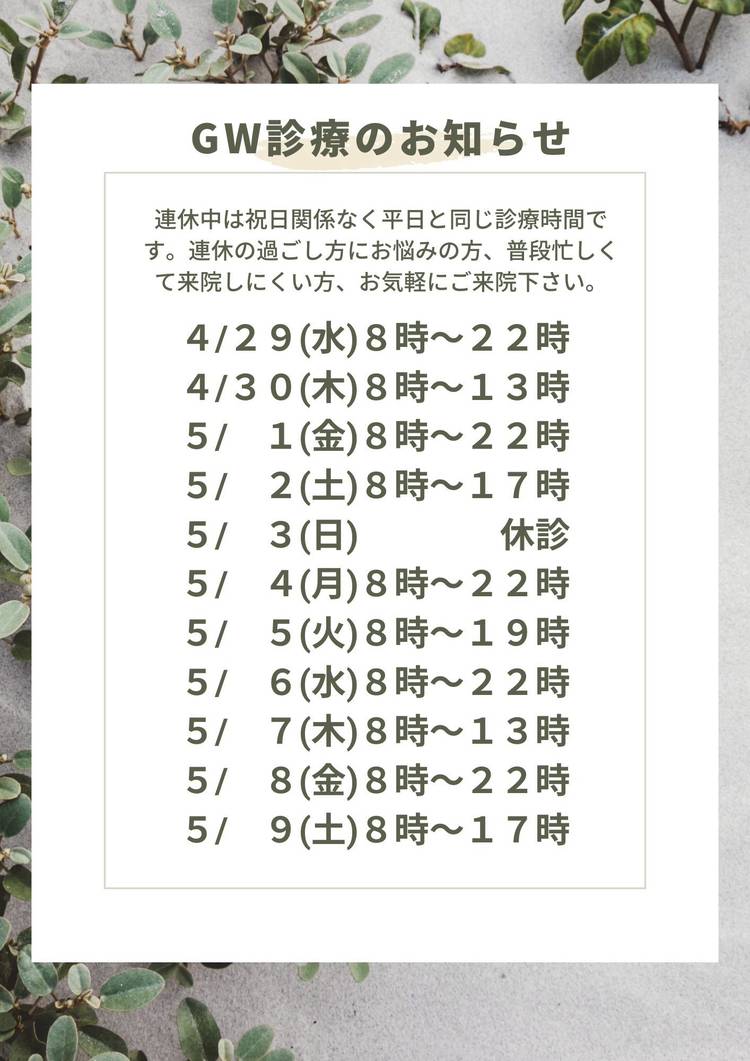 【休診日】 日曜日 第2・第4木曜日 【祝日診療】8~13