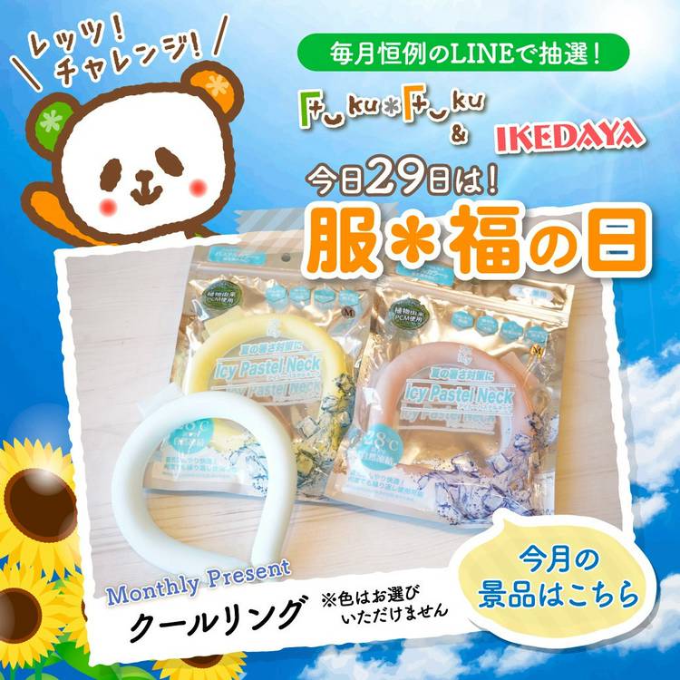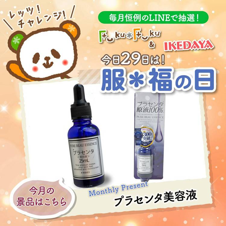 今回の景品は【化粧のノリが良くなりたい方】必見です👀 Fuku*Fuku&IKEDAYAファンの 皆さま、お待たせしました✨ 【毎月29日は服*福の日】 LINE友だち限定 豪華プレゼント抽選会🎉 今月は当店でリピーター率No.1! 【プラセンタ美容液】を5名様にプレゼント🎁 📢お客様の声 「化粧ノリがいいのでやめられません」 「ずっと使っています。とても肌が若返ってきます」 「と...