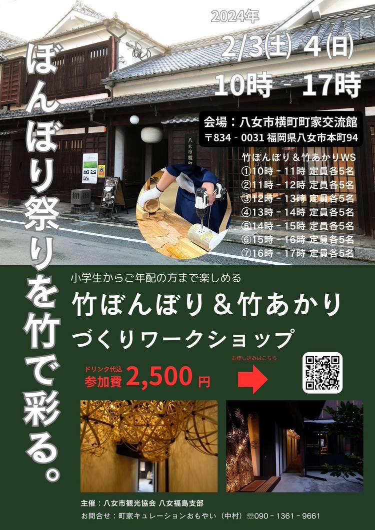【イベント告知】2024年2月3日(土)4日(日)の2日間、八女市横町町家交流館(福岡県八女市本町94)にて「ぼんぼり祭りを彩る 竹ぼんぼり&竹あかりづくりワークショップ」を開催します🎋 参加費は2,500円✨ 時間は10時から17時までです⏰ 1時間ごとに各5名定員です🈵 受付で「竹ぼんぼり」か「竹あかり」のどちらを体験したいかをお伝えください📢 ①10時~11時 ②11時~12時 ③...