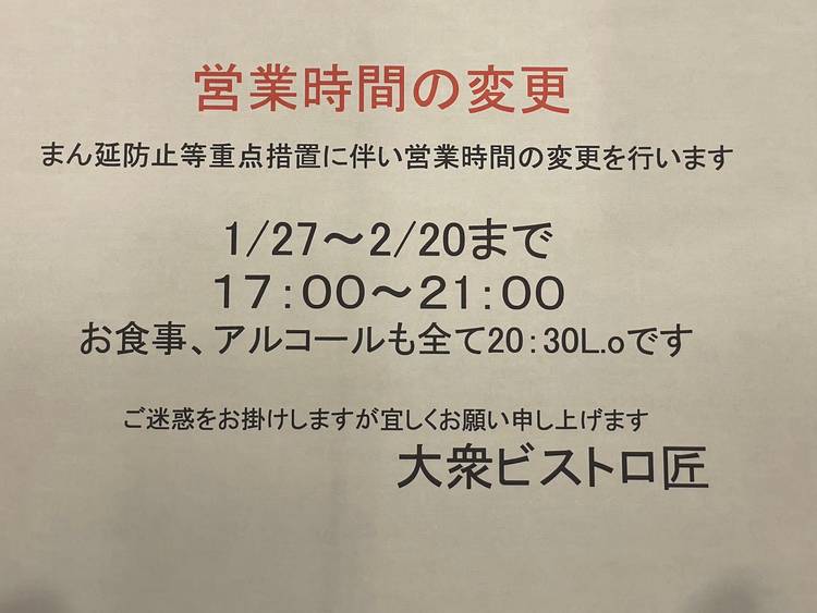 大衆ビストロ匠です。 4月のお勧めメニューのお知らせです😃 「天然本マグロ中トロのカルパッチョ 香味野菜のソース」 上質な天然の本マグロの中トロ☺️聞くだけで美味しいですね。濃厚な旨味をマグロのカラスミとさっぱりとしたソースとで味わってください。 「黒毛和牛ホホ肉のとろとろ赤ワイン煮込み」 美味しいほほ肉が入りました。 じっくりととろとろになるまで煮込みました。 かなり美味しいのでぜひ食べ...