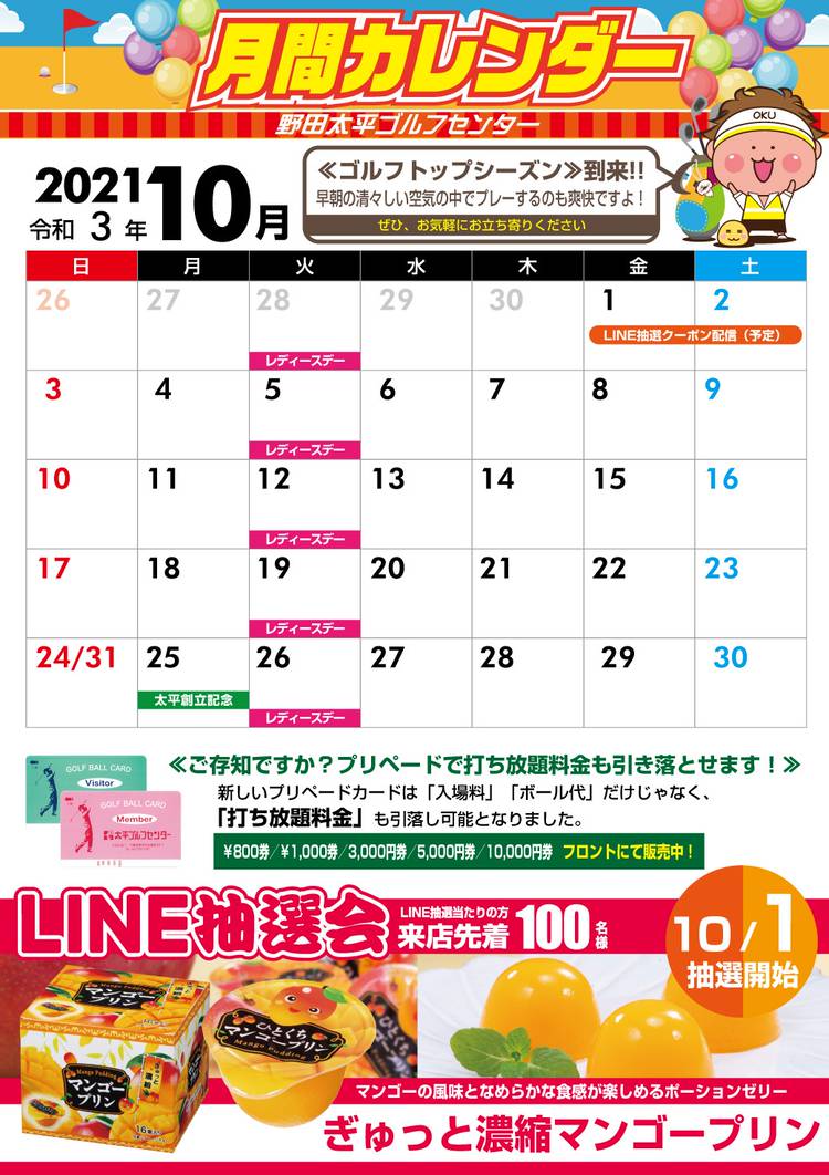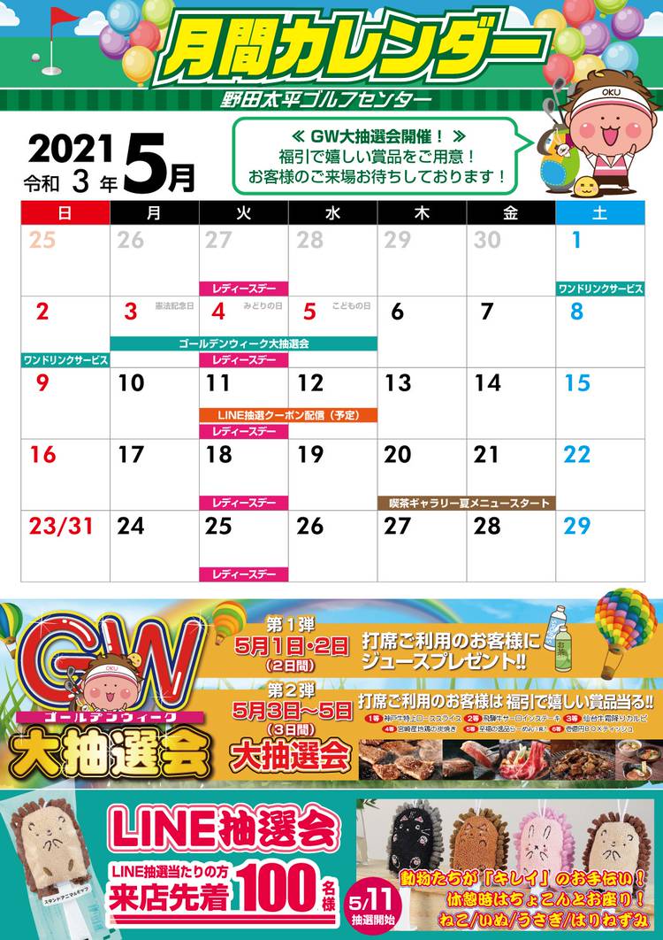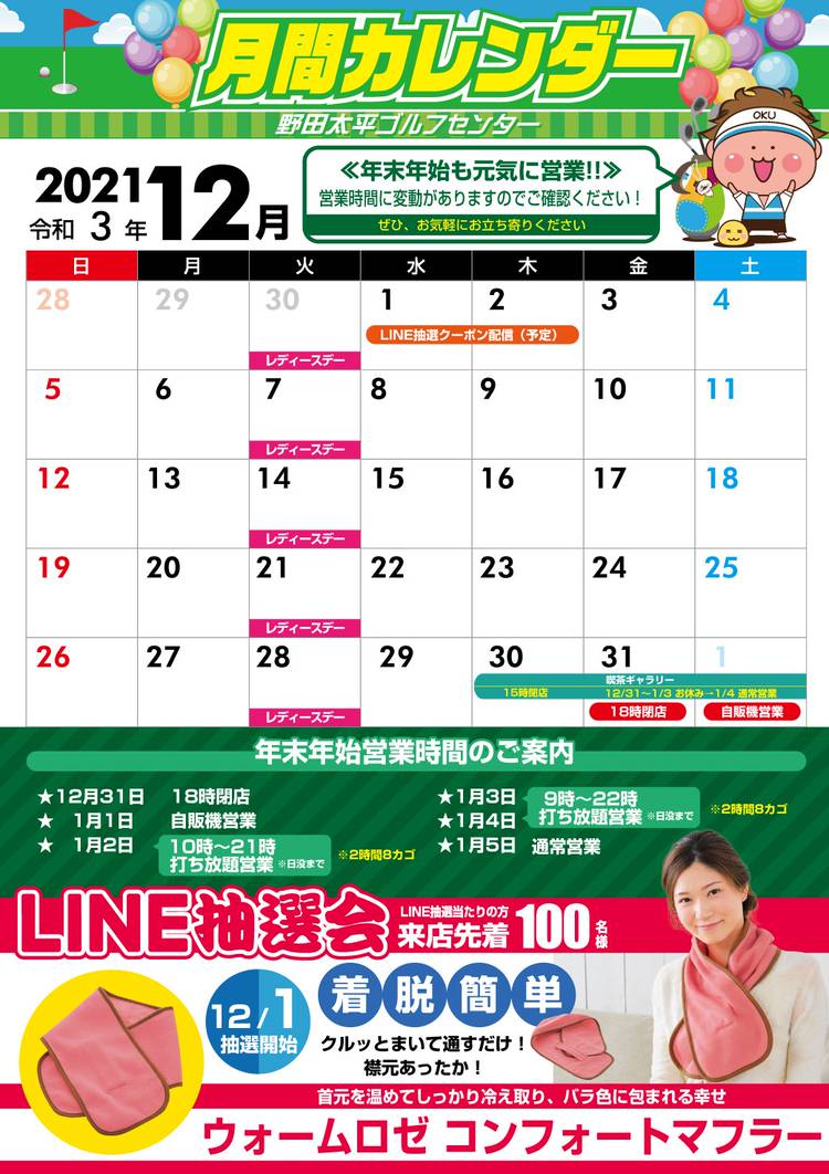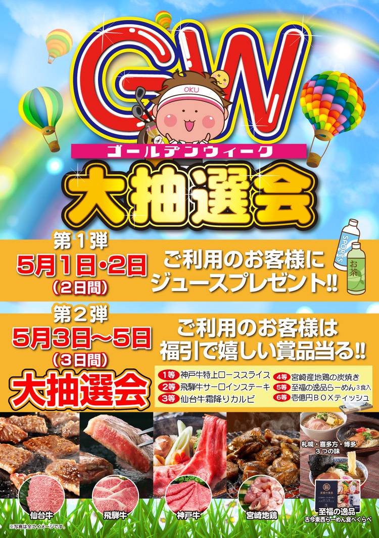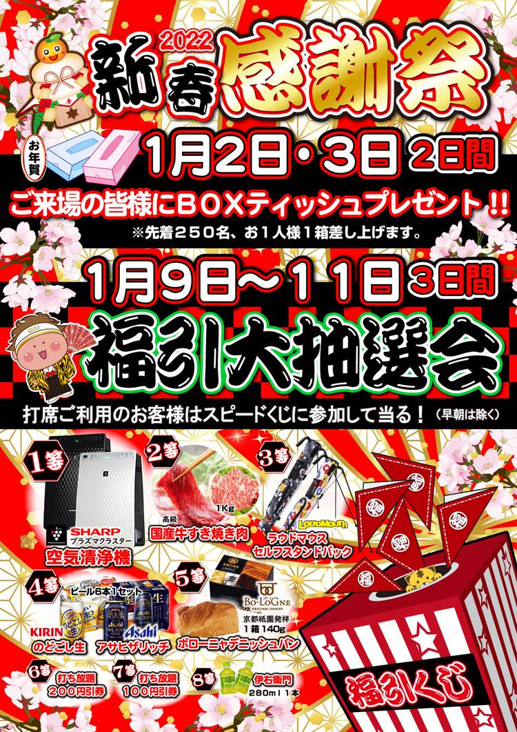 2024🌄明けましておめでとうございます! 2024🎍新春感謝祭 開催!! 2024年1月2日・3日の2日間 ご来場の皆様にBOXティッシュプレゼント!! ※先着250名、お一人様1箱差し上げます。 福引大抽選会 2024年1月13日(土)~15日(月)の3日間 打席ご利用のお客様は スピードくじに参加して当たる! (早朝は除く) -------------------- 賞品 ★1等...