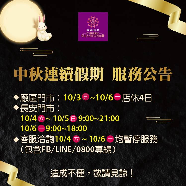 📢台灣光復暨古寧頭大捷紀念日 連假服務公告📢 🟡客服洽詢 10/24(五) ~ 10/26(日) 🚫暫停服務🚫 (包含FB / LINE / 0800專線 / 客服信箱) 🟡廠區門市 10/25(六) ~ 10/26(日) 店休 2 日 🟡長安門市 正常營業 ✔️營業時間 9:30 - 21:00 📱TEL:02-2509-2816 歡迎爺粉們來探班 呷甜甜唷😍 📣療...