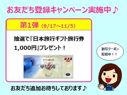 お友だち登録キャンペーン実施中 第1弾:9/17~11/5 期間中に新規お友だち登録していただくと 抽選で「日本旅行ギフト旅行券1,000円」をプレゼントします!! GoToキャンペーンにも使えるお得な割引クーポンも配布中です ↓マークをタップしてお友だちに教えてね