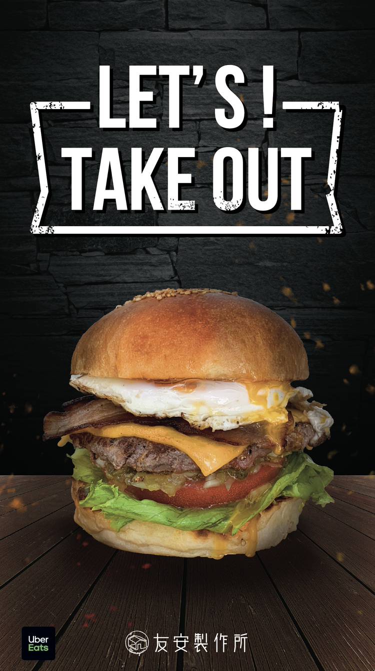 - ハンバーガーとドリンクのテイクアウト営業を始めました。友安製作所オリジナルバーガーをお持ち帰りしていただけます!ぜひご自宅やオフィスでお楽しみください。