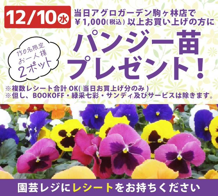 アグロガーデン神戸駒ヶ林店の公式アカウントです。 雑貨もペットもファッションも充実の「神戸らしいホームセンター」から、最近情報やLINE限定のクーポンなどを配信 2Fにはペット、ペット用品や動物病院、雑貨、ファッション、本、文具、インテリアも充実。 1Fでは、DIY女子を応援する資材館をはじめ、生花、観葉植物、ガーデニング用品、電化製品、日用品、生活用品、レジャー用品、自転車なども。アグロ畑では産直野菜やこだわり調味料を販売中。精米所を兼ねた米工房、肉のマルヨネ、魚銀の鮮魚コーナーも人気です。 <公式サイト>アグロライフ http://agrolife.jp/ <所在地> 神戸市長田区南駒栄町1-7 <営業時間> 本館:午前9:30~午後8:00 資材館:平日 午前7:00~午後8:00 日曜 午前8:00~午後8:00