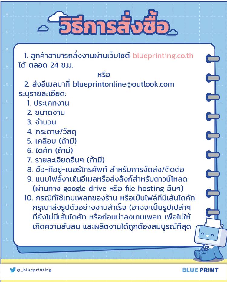 1. สั่งทางเว็บไซต์ blueprinting.co.th ได้ตลอด 24 ชม. 2. สำหรับสินค้าหรือจำนวนที่ไม่สามารถสั่งผ่านเว็บไซต์ได้ ลูกค้าสามารถส่งอีเมลมาที่ blueprintonline@outlook.com ได้เลยค่ะ