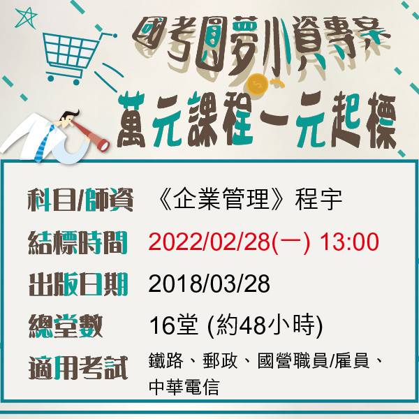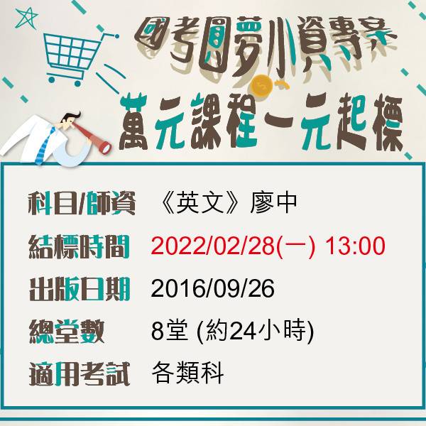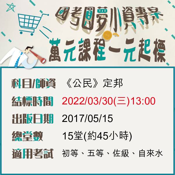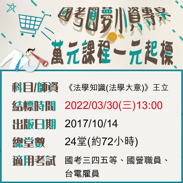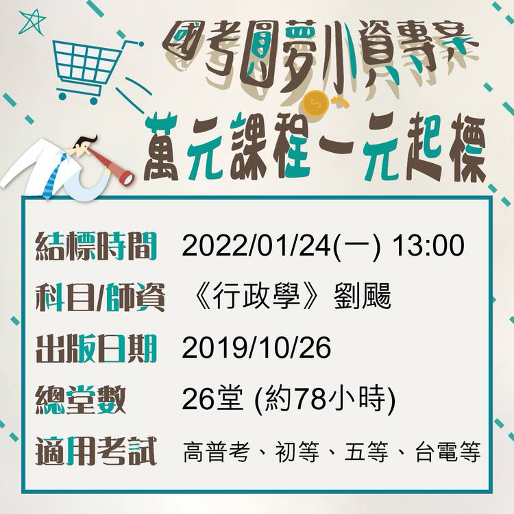 本篇已於2022/08/01(三)13:00結標(流) 【一元起標活動0715~0801】 結標時間:2022/08/01(一)13:00 →《行政法》← 師資:徐晉文 出版日期:2019/12/08 總堂數:18堂(約54小時) →《基本電學》← 師資:陳睿 出版日期:2016/05/16 總堂數:20堂(約54小時) 競標方式: 直接於本貼文留言欲出價金額, (例如:行政法 600元)...