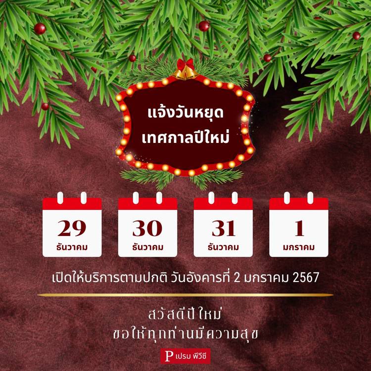 แจ้งวันหยุดเทศกาลปีใหม่....เปรม พีวีซี หยุดปีใหม่วันที่ 29 ธันวาคม - 1 มกราคม . 📌 เปิดวันอังคารที่ 2 มกราคม 2567 ✨ . ขอบคุณคุณลูกค้า..ที่อุดหนุนสินค้ามาตลอดทั้งปี 🙏
