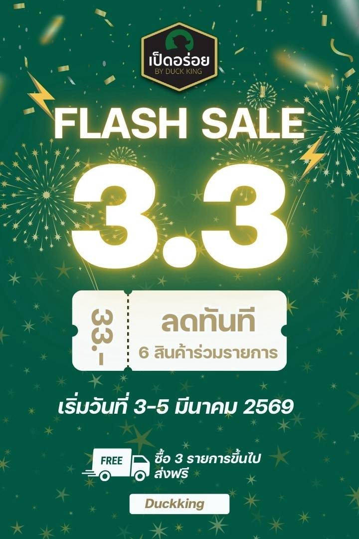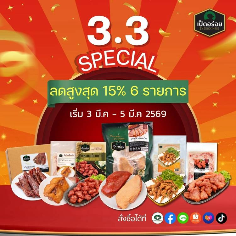 3.3 โปรพิเศษ 🔥 ลดจริงไม่จกตา ลดสูงสุด 15% (เฉพาะสินค้า 6 รายการ - อกเป็ดรมควัน 1 กก./ เนื้อเป็ดสวรรค์/ ลิ้นติดเขี้ยวหมักงา/ แหนมเอ็นแก้ว/ ดั๊กเทล/ บั้นท้ายเป็ดหมัก) ✅ ค่าจัดส่ง 180 บาท ✅ 3 รายการ ส่ง...