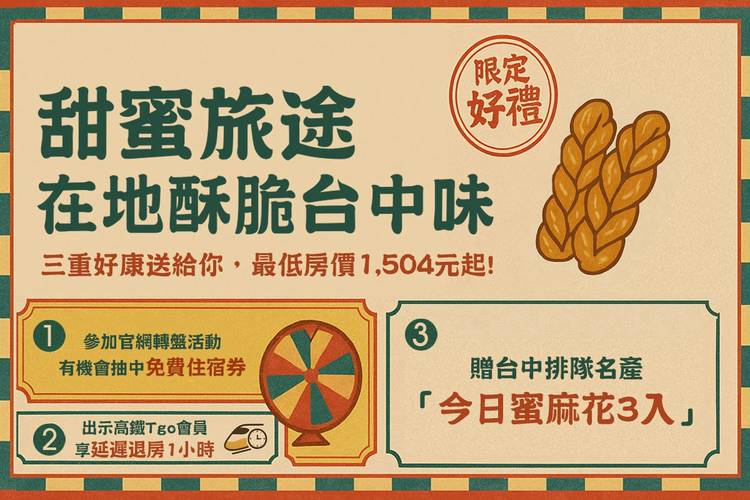 高鐵飯店聯票 × 新驛旅店台中車站店|Me Time!獨旅慢行 【高鐵飯店聯票】官網訂房加購高鐵車票享平日(週一至四)78折、假日(週五至日)及高鐵疏運期間85折優惠,雙人台北-台中來回最高省620元起。 入住新驛旅店台中車站店,輕鬆暢遊台中火車站周邊的經典景點,如宮原眼科、綠川水岸、台中文學館、第二市場等,享受便捷的城市漫遊體驗。 📍 專案優惠 1. 贈送暖身又暖心SWISS MISS即溶...
