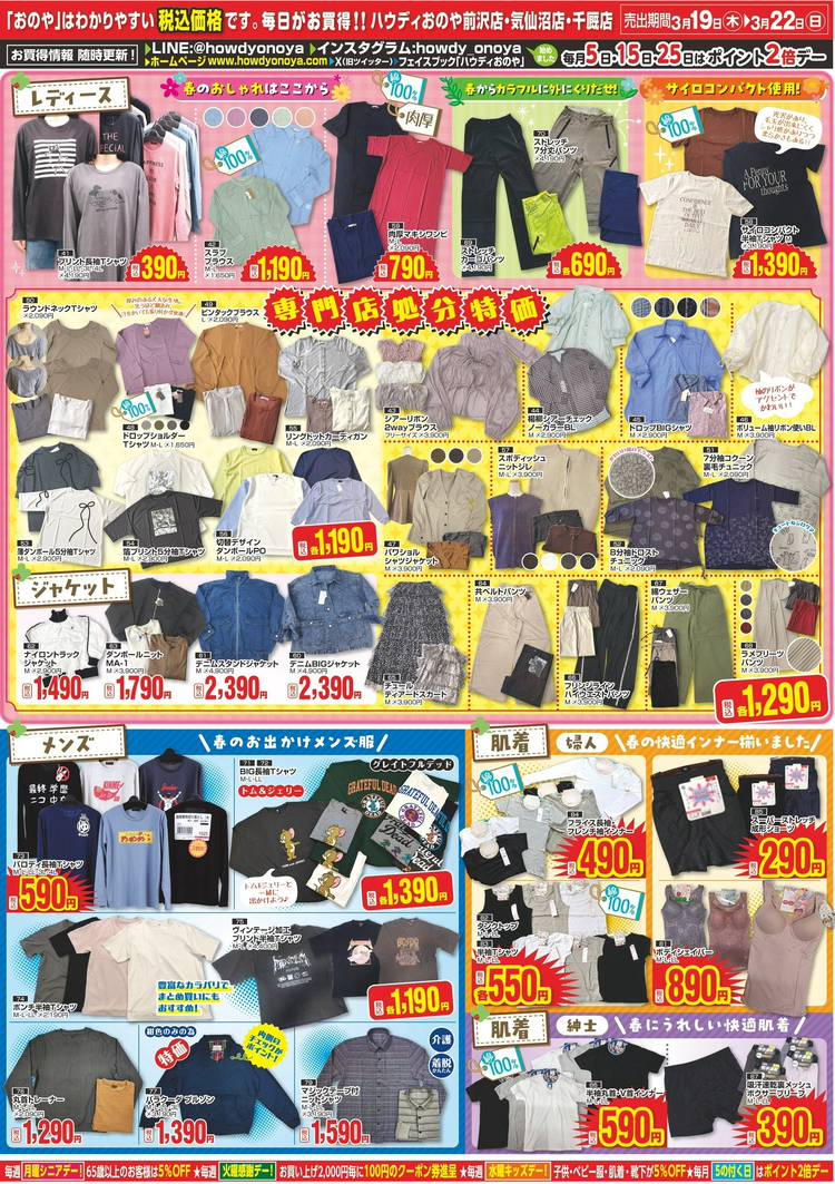 ハウディおのや 豊富な品揃えと安さが自慢の衣料品店です。お洒落なファッション衣料から毎日着る肌着・靴下、小物からリビング用品まで、お手軽価格で取り揃えております。 【千厩店】岩手県一関市千厩町石堂30-1 (国道284号、千厩警察署・千厩高校隣)TEL: 0191-53-2446 【前沢店】岩手県奥州市前沢区向田2丁目37 (国道4号、イオン前沢店様向かい)TEL: 0197-56-3970 【気仙沼店】宮城県気仙沼市四反田150 (気仙沼保健所隣、デイリーポート新鮮館様向かい)TEL:0226-21-1011