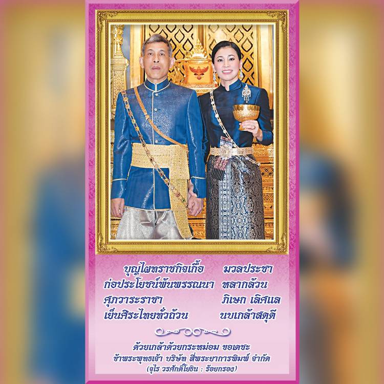 เฉลิมสุขเคียงคู่คล้อง ภูวไนย เฉลิมเกียรติก้องเกริกไกร ก่องหล้า เฉลิมศรีปิ่นสมัย จรัสรุ่ง เรืองเฮย เฉลิมพระชนม์ยืนยิ่งฟ้า พรั่งพร้อมพระพรชัย ด้วยเกล้าด้วยกระหม่อม ข้าพระพุทธเจ้า บริษัทสี่พระยาการพิมพ์...