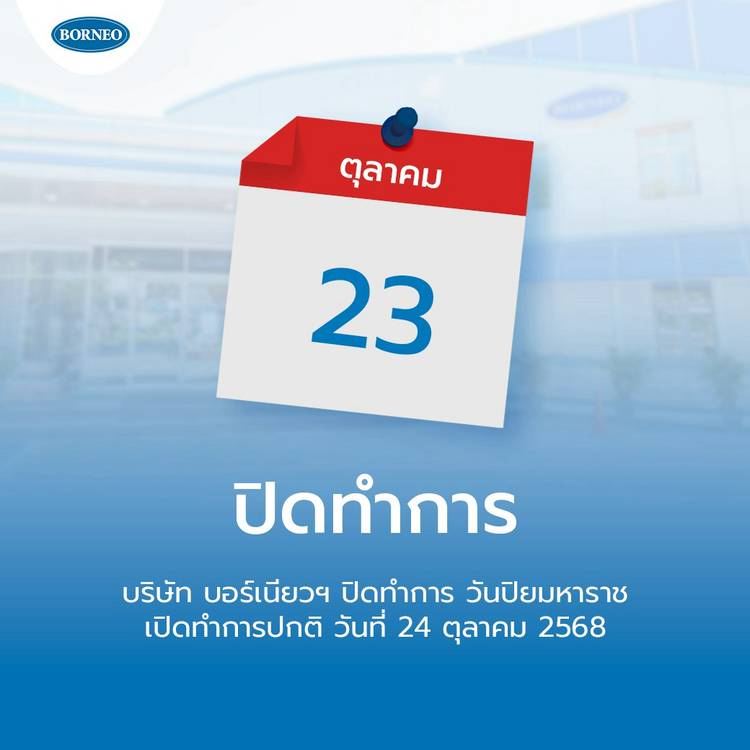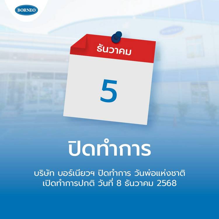 ทางบริษัท บอร์เนียว เทคนิเคิล (ประเทศไทย) จำกัด . ขอแจ้งปิดทำการในวันที่ 5 ธันวาคม 2568 และจะเปิดทำการตามปกติอีกครั้งในวันที่ 8 ธันวาคม 2568 . 🙏 ขอบคุณลูกค้าทุกท่านที่เข้าใจและไว้วางใจเราเสมอ