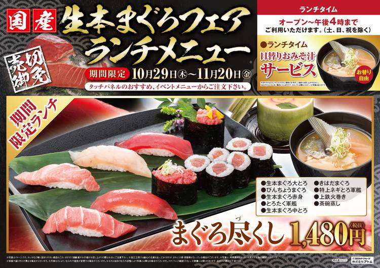 『ぶりと冬の寒便り』販売開始! 11月11日より、冬のおすすめメニューが全17品登場! 冬の「ぶり」は脂のり抜群で、寒くなればなるほど美味しくなる冬の人気ネタ!職人技が光る創作寿司もご賞味ください。 そして、身にしっかりとした甘味と濃厚な旨味を持つ高級白身魚「甘鯛」や、醤油を弾くほどの濃厚な脂の旨みと甘みが絶品の「八角」もご用意! 是非この機会に、今しか食べられない期間限定メニューをご堪能ください...