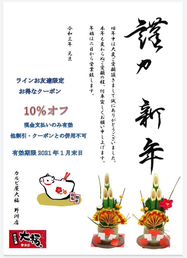 美味しい笑顔、楽しい会話、みんなに大きな福が来ますように。 大福のスープは・・・ 厳選素材を使って、さっぱりとした味の中に、コクと旨味を詰め込んだスープです。 大福のキムチは・・・ 癖のない食べやすさと、お口の中にいつまでも残らない、自然の辛さにこだわりました。 大福のお肉は・・・ 安全で安心できるお肉を使用しています。 和牛は店内に個体識別番号を表記し、美味しさはもちろん、安心して楽しいお食事ができる環境を心掛けています。