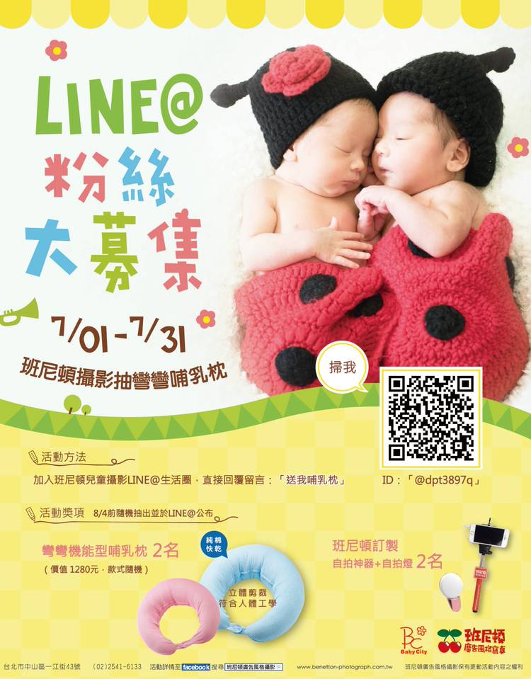 【Line@募集粉絲!】07/01-07/31班尼頓抽彎彎哺乳枕 活動辦法: 加入班尼頓兒童攝影LINE@生活圈,並回覆留言:「送我哺乳枕!」 活動獎項:(隨機抽出) Baby City彎彎機能型哺乳枕-2名(價值1280元,顏色隨機) 班尼頓客製自拍神器+自拍燈-2名