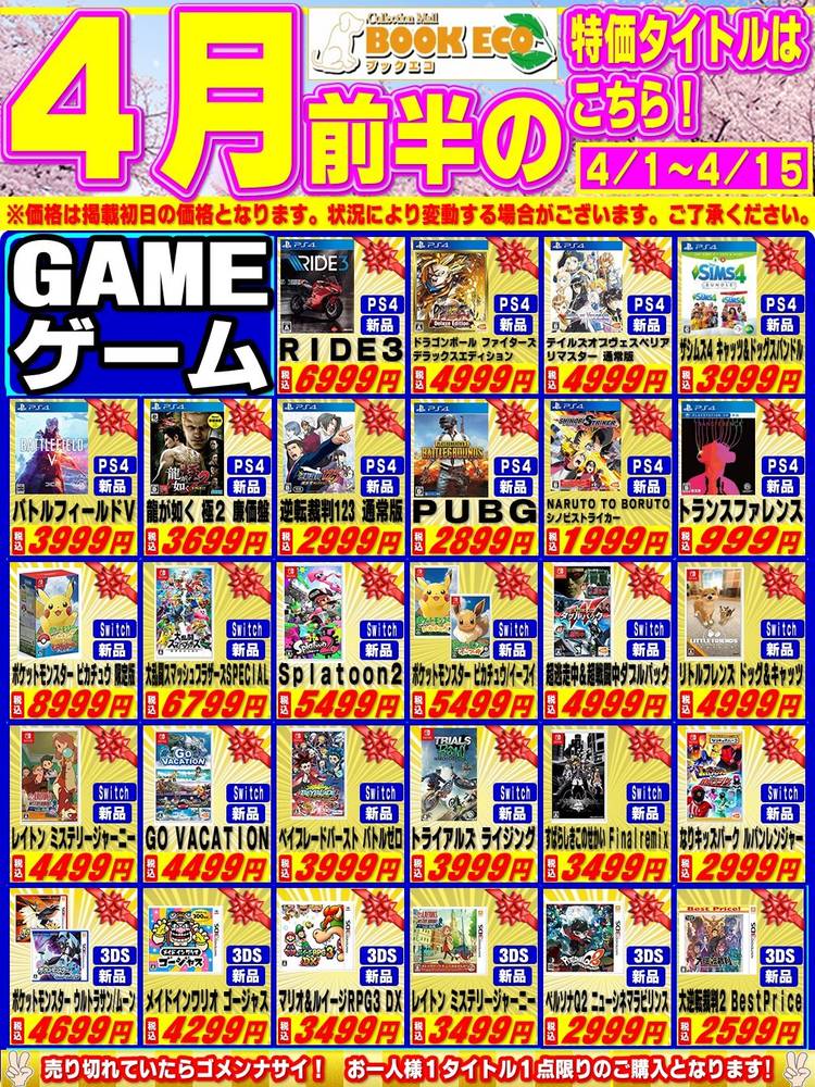 福岡/熊本を中心に展開する総合リサイクルショップ「ブックエコ-bookeco-」です。 コミック・書籍・ゲームソフト・CD・DVD・Blu-ray・トレーディングカード・フィギュア・雑貨・おもちゃ・デジタル家電などが沢山! 地域No.1の品揃え&価格を目指して日々全力営業中ですヽ(*´∀`)ノ ブックエコはヤフーショッピング上でネットショップも運営しております。 ゲームソフトなど販売点数20万以上!!ここにしか無い珍しい商品があるかも!? http://store.shopping.yahoo.co.jp/collectionmall/ 店舗だけでなくネットでも通信買取を行っております。 お家に眠っているゲームや本、CD、DVD、おもちゃなどはコレクションモールにお売りくださいませヽ(*´∀`)ノ http://acoa-net.sakura.ne.jp/bookeco-kaitori/ ヤフーオークションにて毎日多数出品中! ブックエコは日本最大級のネットオークションサイト「ヤフオク」で現在3箇所営業中です(´∀`*) ほぼ毎日商品が出品していますのでお宝商品などお見逃しなく(*´∀`)ノ ブックエコ 通販店 ゲームソフトや雑貨、家具、レトロ商材やレアな物を中心に出品中! アニメやドラマの完結レンタルDVDセットも好評出品中です! http://sellinglist.auctions.yahoo.co.jp/user/game_garage_net コレクションモール ヤフオク店 古着やフィギュア、おもちゃ、釣具などを中心に出品中! http://sellinglist.auctions.yahoo.co.jp/user/collection_mall ブックエコ 浅川通販店 携帯電話などのデジタル家電やトレカ、DVD等を中心に出品中! http://sellinglist.auctions.yahoo.co.jp/user/book_eco_501 Twitterもやってます。 新入荷アイテムなどタイムリーにつぶやいています。 https://twitter.com/bookecorecycle