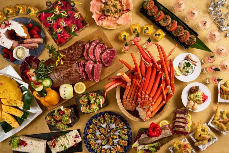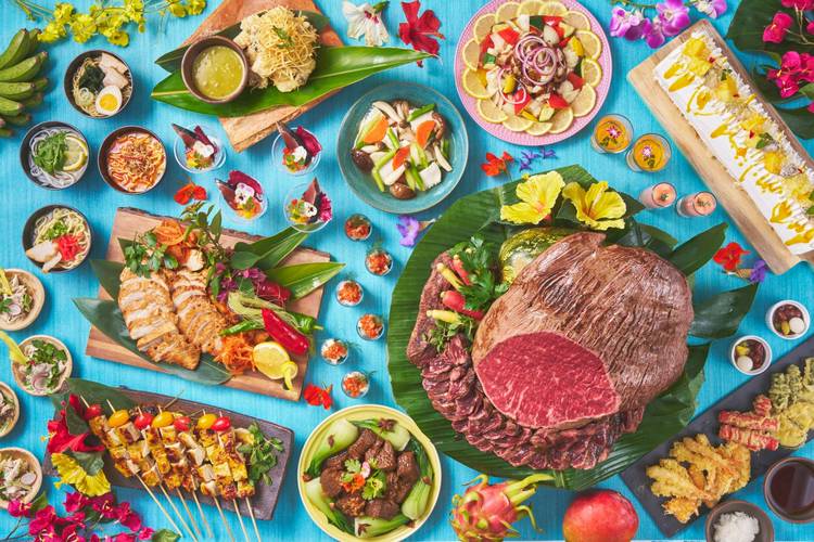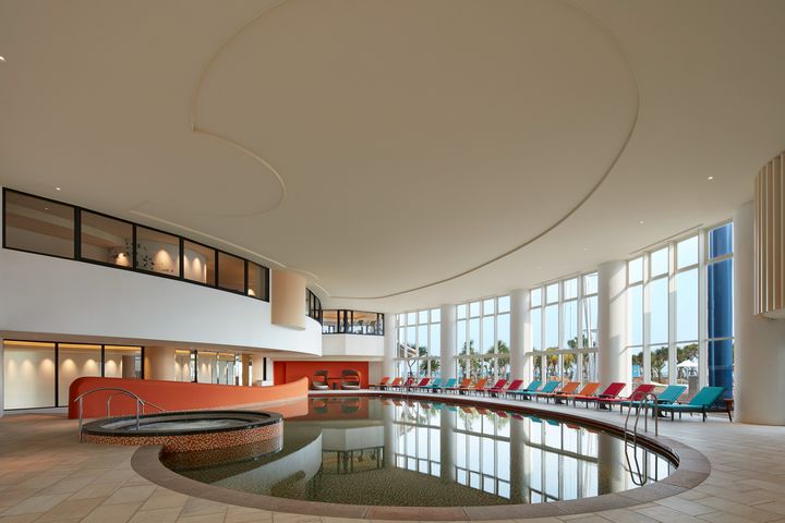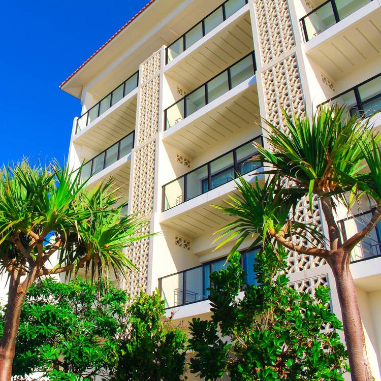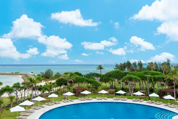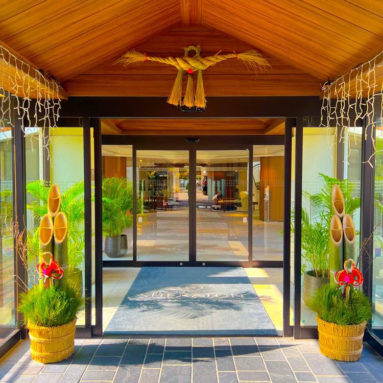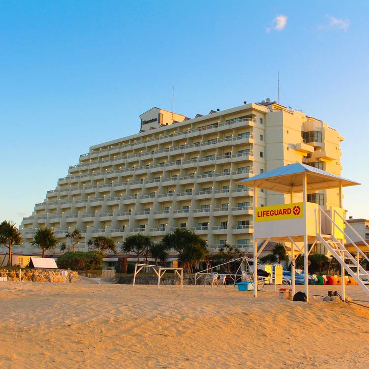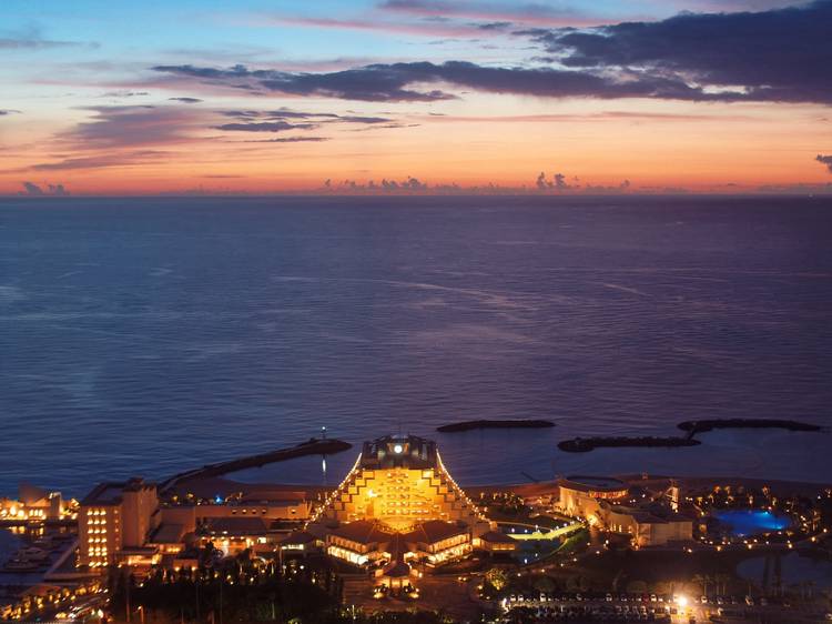 夕暮れ時と夜のホテル、上から覗いてみるとこんな景色が広がります。 建物の灯りとライトアップで、リゾート感がさらに強まり幻想的な世界。ピラミッド型の本館も美しく輝いています。昼と夜、異なる雰囲気のホテルをお楽しみください。
