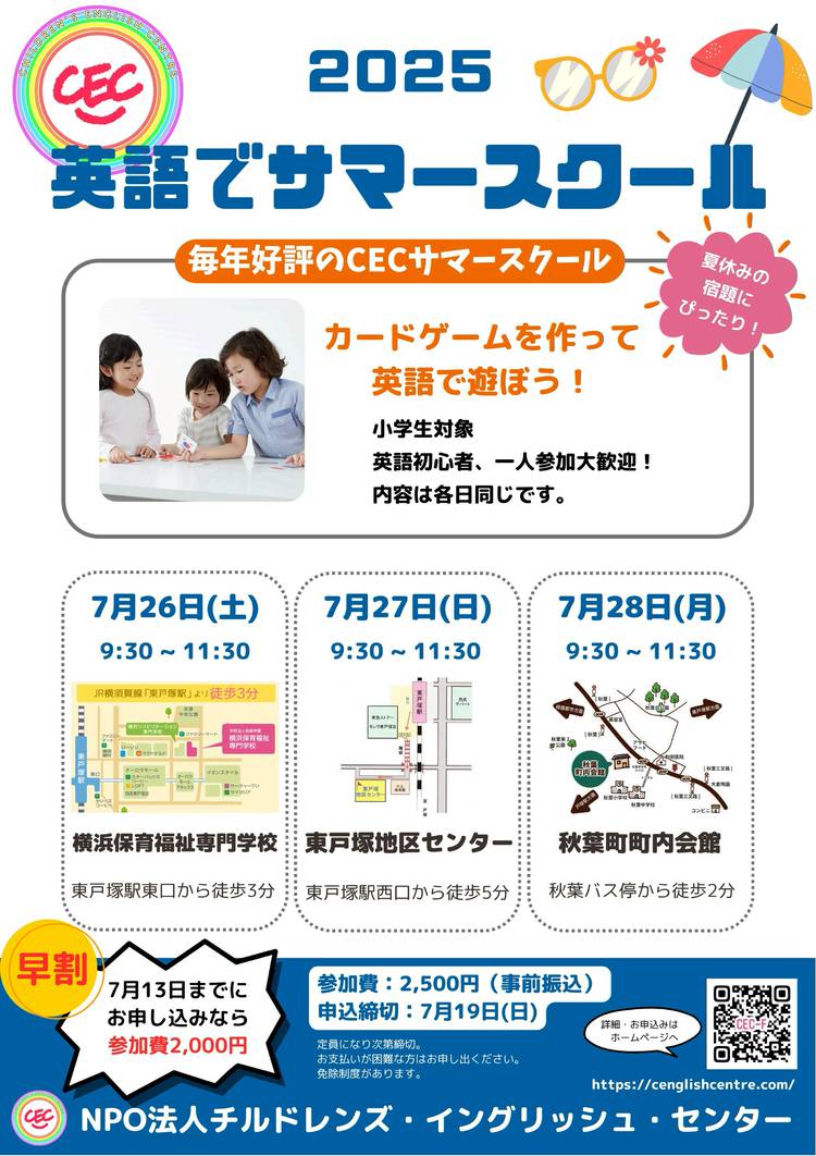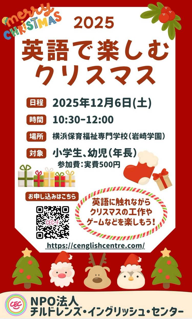 / イベントは今週 まだまにあいます★ 普段レギュラーレッスンに通えない人も 次年度以降入学を検討している人も \ 🎄✨子どものためのクリスマス英語イベント開催!✨🎄 英語で楽しむクリスマス🎅 英語でクリスマス工作&ゲーム! 「楽しい!」が英語の入り口になる特別な時間です。 申込みはCECのウェブサイトから。 参加をお待ちしています🎄✨ https://cengishcentre.com/...