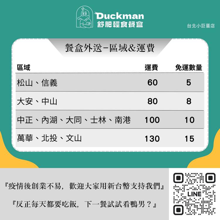 我們鴨男現已提供外送服務,讓您輕鬆品嚐美味健康的餐點。只要在台北市,無論您身在哪個地區,我們都能送到您手中,讓您享受舒適的用餐體驗。 請參考附圖,了解我們的外送區域及相應的價錢。 不論是在辦公室、在家中或是其他地點,只需透過Line訂購,您就能輕鬆享受到新鮮、健康美味的舒肥輕食餐盒。感謝您的支持! #鴨男 #外送服務 #多區域配送 #健康餐盒