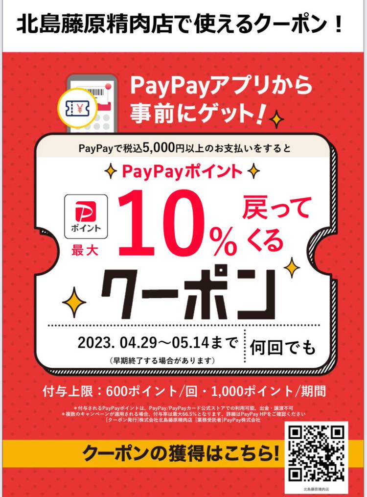 PayPayクーポン使用可能期間:4月29日~5月14日徳島では珍しい!最大10%戻ってくるクーポン!5000円以上のお支払いで使えます。※付与上限:600ポイント/回 1000ポイント/期間※十分にご用意したつもりですが、早期終了する場合があります。
