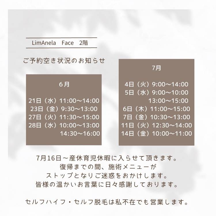 【産休までのご予約空き状況🈳】 7月16日より産休育児休暇に入らせて頂きます。 施術メニューがストップになりご迷惑をおかけします。 ご予約空きをみて予約希望の方は連絡ください😊 皆様から温かいお言葉を頂け 楽しみやねーと待ち遠しく思って下さったり、 ご新規様もお休み了承の上、お申込みして下さったり… 本当に日々感謝しております🥲 ありがとうございます。 セルフハイフ・セルフ脱毛のみ...