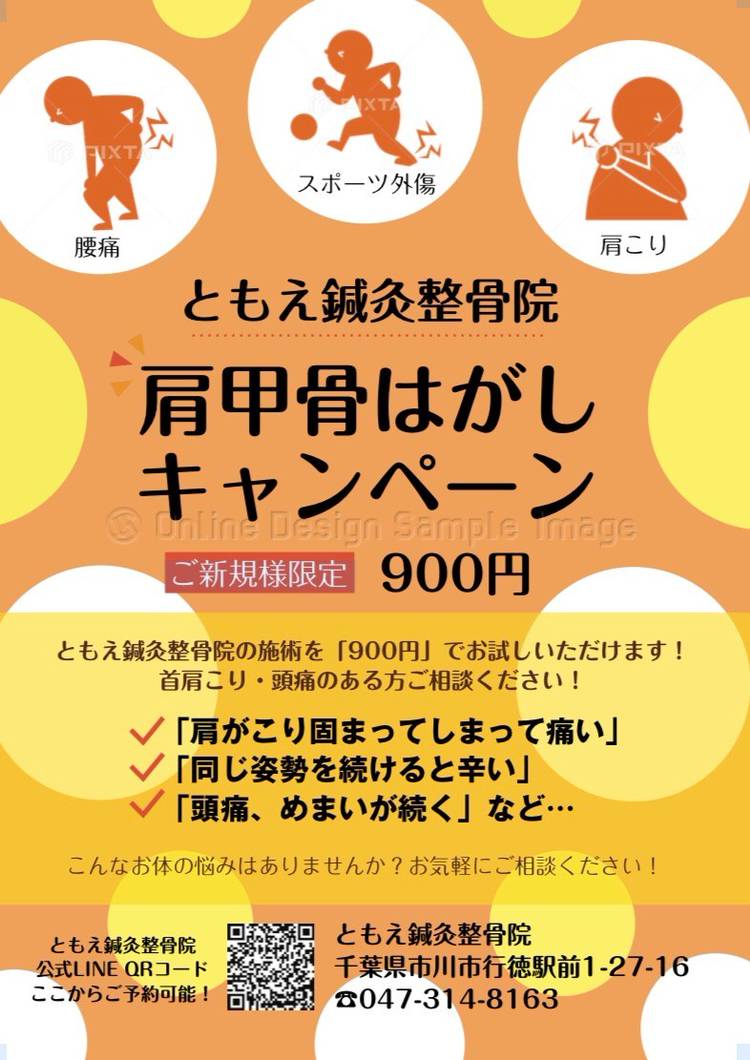 市川市行徳駅徒歩3分のともえ鍼灸整骨です! ●受付時間● 月~土9時~20時 ●休診日● 日曜、祝日 ●ご案内につて● 当院では待ち時間を有効にお使いいただく為に予約診療をおこなっておりますが、初めて来院される方のお時間を設けておりますので直接来院していただいても可能ですが、すべてご予約がうまってしまう場合もございますので事前のご予約をおすすめさせていただきます。 ●ご予約方法● ・お電話 047-314-8163 ・LINE@ トーク 各種保険取り扱い、交通事故、労災対応、土曜診療、平日20時まで診療しております。 骨折、脱臼、捻挫、打撲などのお怪我の治療もお任せください! 鍼灸治療もおこなっております。 美容鍼、骨盤矯正、猫背矯正、O脚矯正、オイルマッサージ、整体などもおこなっております。 随時ご相談も受け付けておりますのでお気軽にご相談下さい!