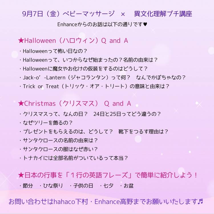 Enhance( English harmony circle)は、英語、歌、絵本等を通して感性を深め、子育てを楽しむことを目的としたサークルです。 レッスンや懇話会などの活動計画等、随時更新していきます。 4つの主な活動内容 (4C) ①早期英語教育について考える懇話会(Consultation) 間違った方法で、あなたとお子様の大切なお金と時間を費やしてしまうことのないよう、 あなたに合った早期英語教育の方法を考える会です。 ②英語コーラス(Chorus) お子さんは、歌も、お母さんの声もお父さんの声も大好きです。 メロディーも、歌詞も、英語の発音も、すべて「芸術」です。 ご家庭で、喜びに満ちた方法でお子さんに英語に触れていただき、感性を深めながら、 お母さん、お父さんにも英語で歌うことを楽しんでいただき、 サークル内では、他の方達とのコーラスを楽しんでいただくことを目標に、 英語の歌を歌います。 お子様向けの童謡から、ディズニー等のミュージカル音楽にも挑戦していきます。 ③オリジナル絵本の制作(販売により収入を得ることも可能です) (Creation) お子様への思いを、世界に1冊の英語の絵本にしてみませんか? 日本語で文章を考えて頂き、講師が英訳いたします。 発音のご指導もいたしますので、お子さんに読み聞かせしあげることもできるようになります。 データもお渡しいたしますので、あなたが制作した世界に1冊の絵本を、販売していただくことも可能です。印刷、製本、販売方法等アドバイスいたします。 英語の絵本作家デビューをしてみませんか? ④交流を深める(Communication) ご結婚、出産などを経て、環境が大きく変わった方も多いはずです。 たくさんのお友達に囲まれていた学生時代のように、 Enhanceが、また新しいお友達を作っていただく場になれば幸いです。 ご希望に合わせて、あなたのお名刺を作成いたします。