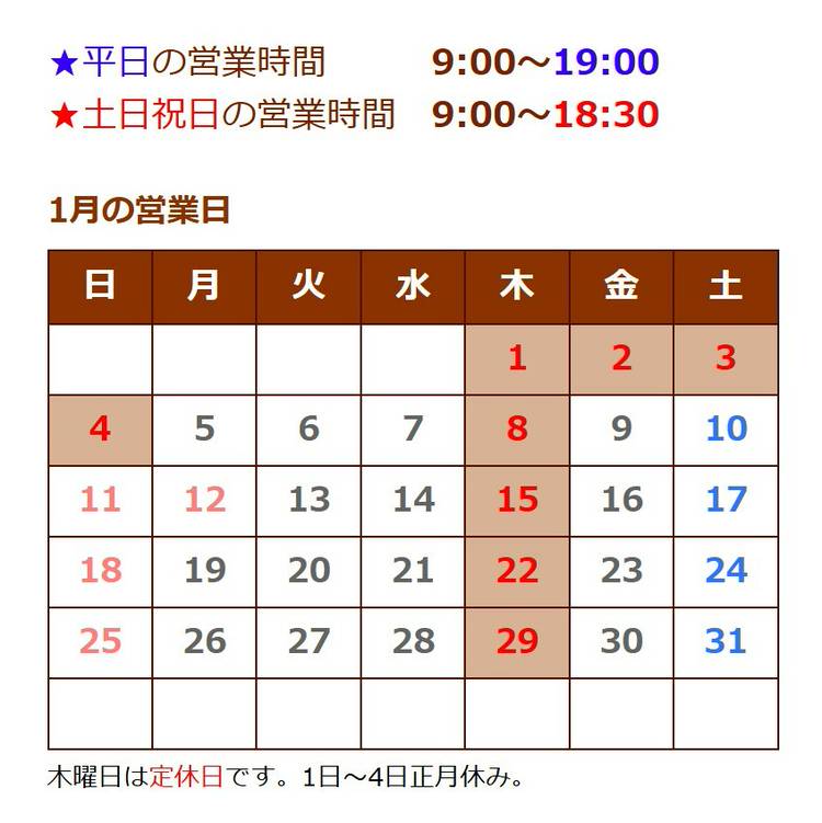 木曜日は定休日です。