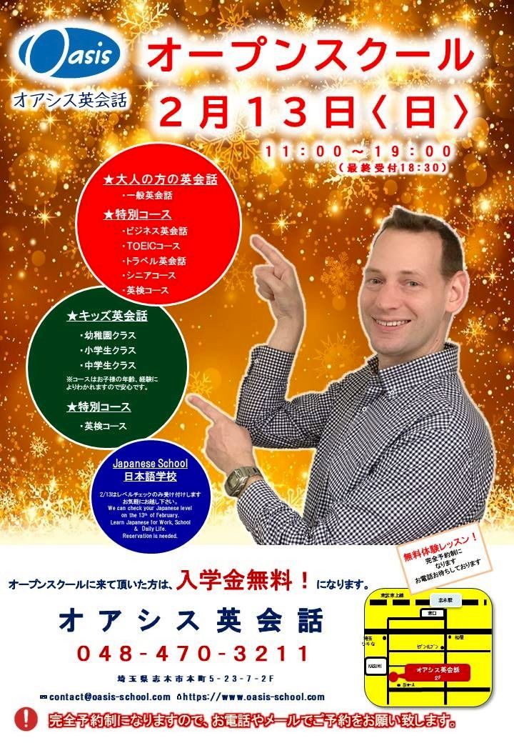 志木市 志木駅より徒歩5分の英会話スクール オアシス英会話、日本語学校です。電話 048-470-3211。住所 埼玉県志木市本町5-23-7 第5ナカタビル2F。