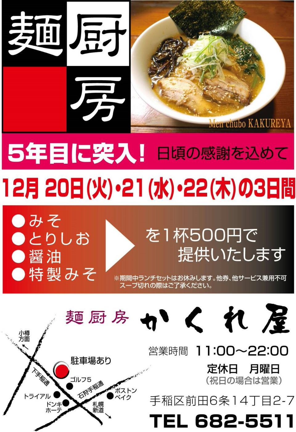 平日限定お得なランチセットは11時~14時まで 「Sセット(ハーフラーメン+半チャーハン)」730円 「Aセット(ラーメン+半チャーハンorネギチャーシュー丼)」830円 「Bセット(ラーメン+ライス+ギョーザ)」 880円 「Cセット(ラーメン+半チャーハンorネギチャーシュー丼+ギョーザ)」930円 夕方6時からは「まぜ麺」550円(数量限定) 店内にはキッズスペースもご用意しておりますので、ご家族揃っておいでください!