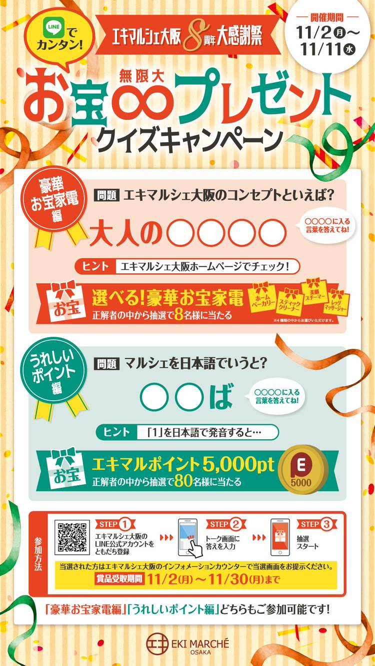 エキマルシェ大阪の館内チラシラックでは、4/27(水)~5/15(日)限定でお得なクーポンを配布しております!! 是非この機会にお得にショッピングをお楽しみください ※特典のご利用には館内設置のチラシについているクーポンチケットとの交換が必要になります。