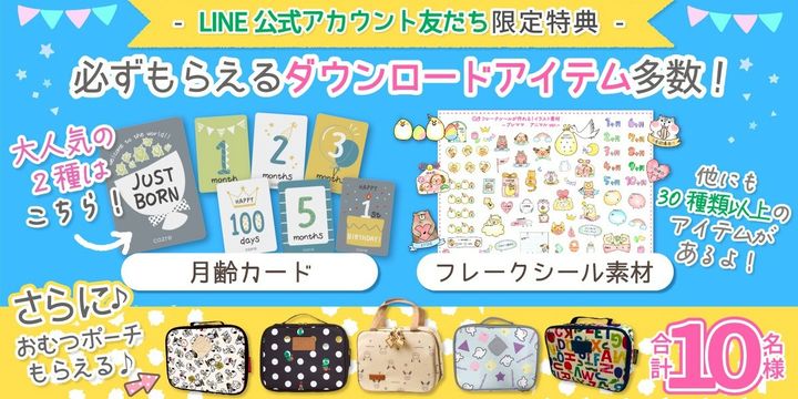 LINE友だち限定で参加できる無料の育児グッズプレゼントキャンペーンや、無料で使える月齢カード・母子手帳に使えるフレークシール素材を無料でプレゼント♡