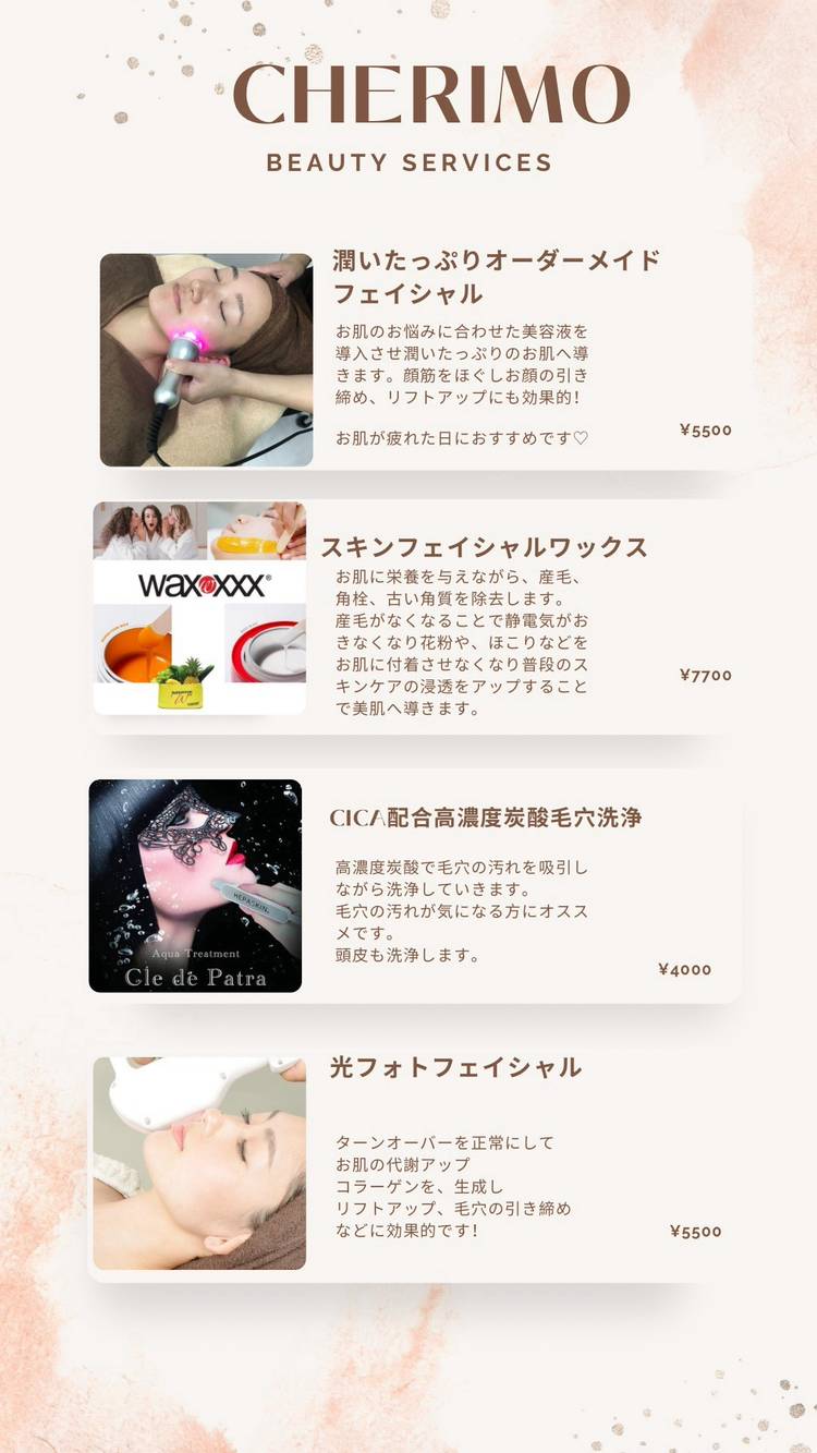 10:00~20:00 フェイシャル最終予約18:00