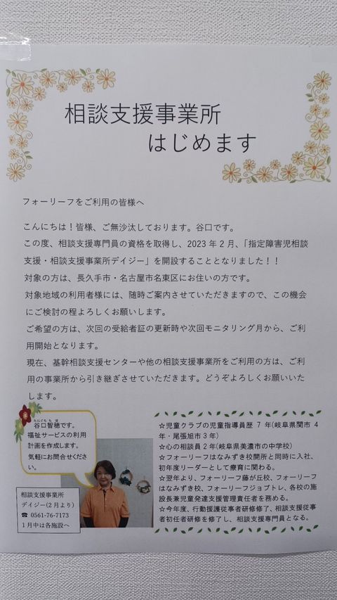 放課後等デイサービス フォーリーフです。 長久手市(はなみずき校)と名古屋市名東区(藤が丘校)にて2施設を運営しております。 学習支援、集団の中でのコミュニケーション能力の向上、社会生活能力の向上に力を入れて活動を行っています。 また、子育てワークショップを定期開催するなど保護者の皆様が子育てを楽しんでもらえる環境作りも行っています。 就労を見据えて、子ども達一人一人が自立し、幸せな人生を歩んで行けるよう精一杯支援していきます。