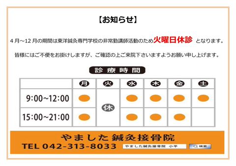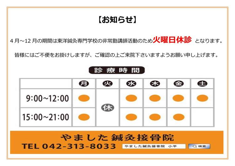 9:00~12:00 15:00~21:00 曜日により変更
