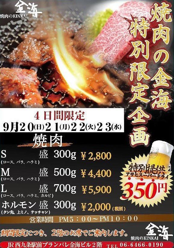 ■食べていただきたい一品 【金海の極上ロース】ぜひご堪能あれ。 本物の料理。お伝えしたい納得の美味しさ ありきたりな言葉になってしまいますが、金海では素材にこだわり、自分たちが本当に「美味しい!」と思うものしか提供致しません。 時に、お時間を頂く料理もございますが、納得の料理を味わって頂く為に手を抜くことはできません。 本物の韓国料理、焼肉を西九条駅前、金海からお届けさせて頂きます。